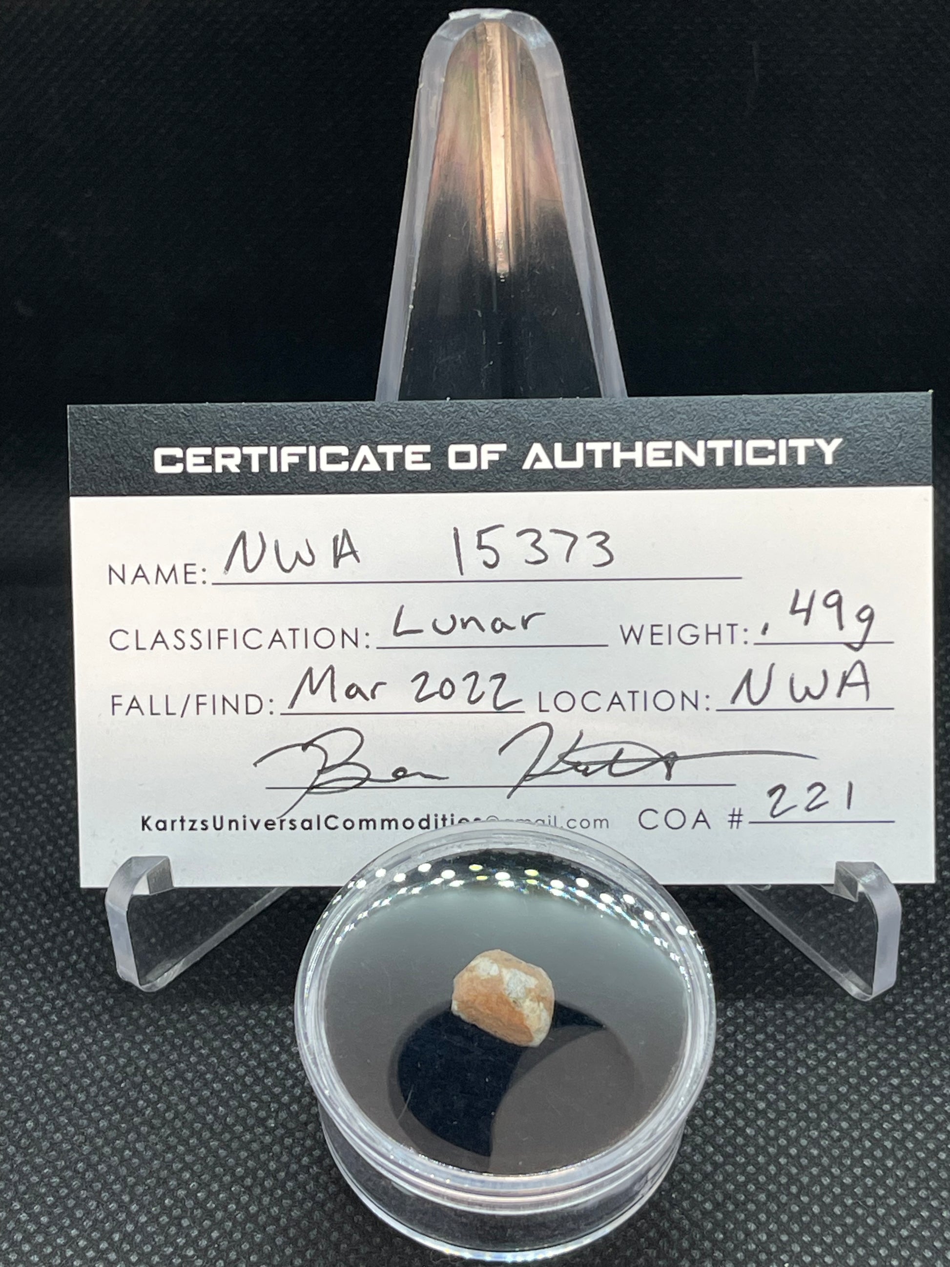 Rock from the moon! Here’s your chance to own some extra terrestrial rock! Not just any rock from space put one from the moon! Classified as NWA 15373, this rock is a lunar breccia. Rocks from the moon here on earth are a result of an asteroid hitting the moon. This sends chunks of the moon into space that land on earth as meteorites. In March of 2022 there was the second largest lunar recovery ever. We are currently experiencing a frenzy of new finds in the Sahara Desert driving prices of things like lunar meteorites to lows never heard of previously. Buy it while it’s plentiful! This specimen is .49 grams and is in a 1.25 inch gem jar. Includes certificate of authenticity.