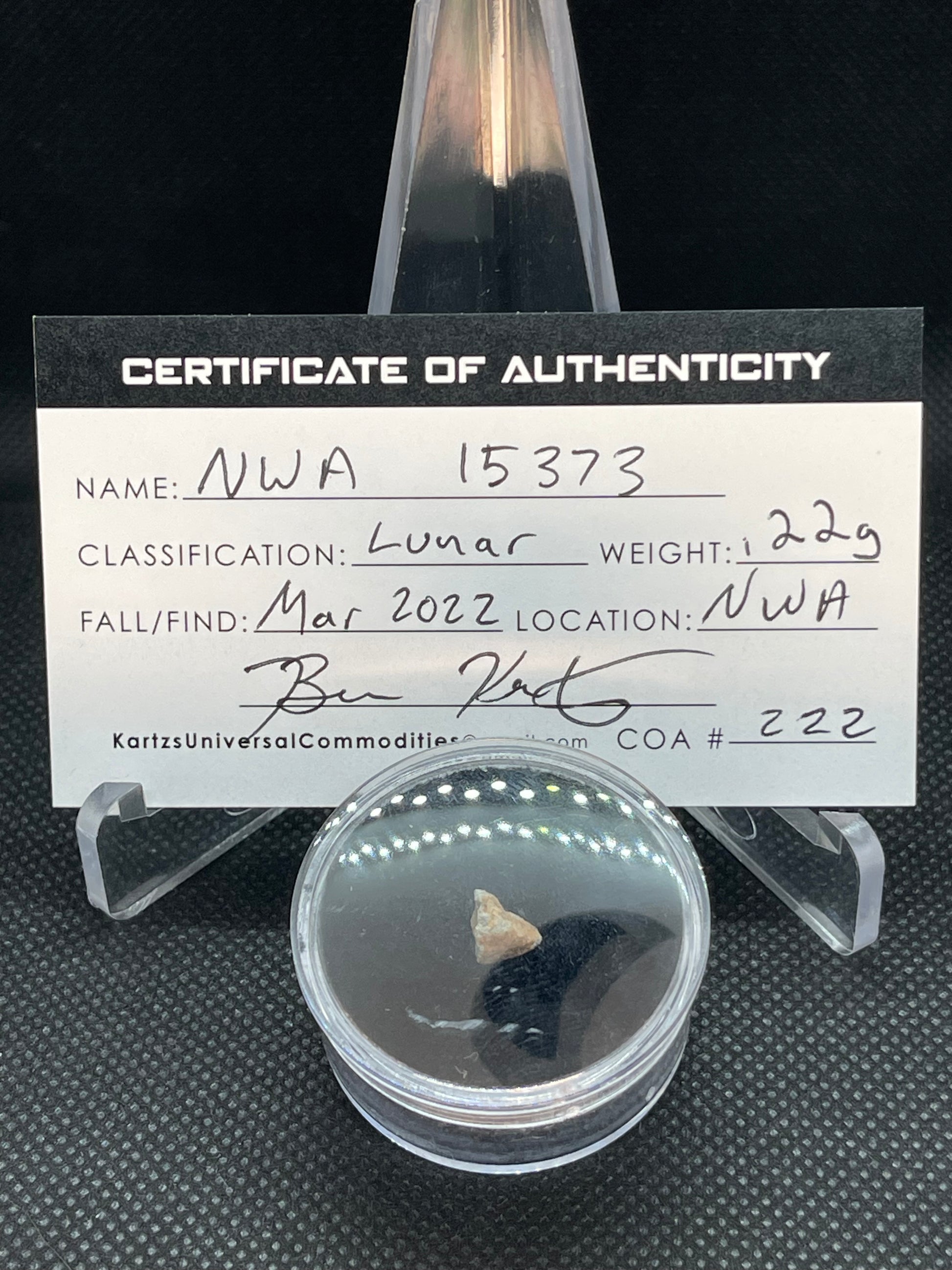 Rock from the moon! Here’s your chance to own some extra terrestrial rock! Not just any rock from space put one from the moon! Classified as NWA 15373, this rock is a lunar breccia. Rocks from the moon here on earth are a result of an asteroid hitting the moon. This sends chunks of the moon into space that land on earth as meteorites. In March of 2022 there was the second largest lunar recovery ever. We are currently experiencing a frenzy of new finds in the Sahara Desert driving prices of things like lunar meteorites to lows never heard of previously. Buy it while it’s plentiful! This specimen is .22 grams and is in a 1.25 inch gem jar. Includes certificate of authenticity.