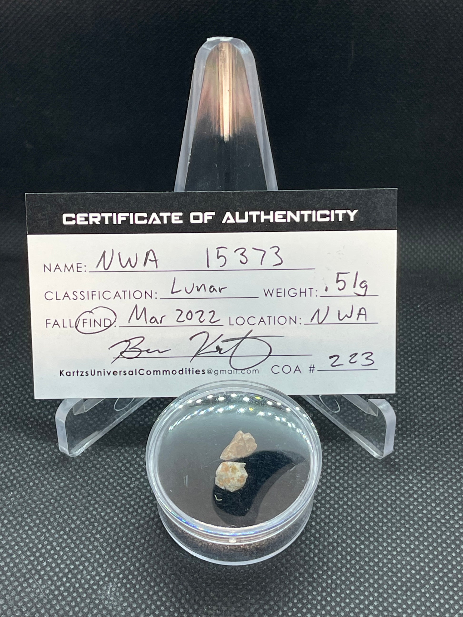 Rock from the moon! Here’s your chance to own some extra terrestrial rock! Not just any rock from space put one from the moon! Classified as NWA 15373, this rock is a lunar breccia. Rocks from the moon here on earth are a result of an asteroid hitting the moon. This sends chunks of the moon into space that land on earth as meteorites. In March of 2022 there was the second largest lunar recovery ever. We are currently experiencing a frenzy of new finds in the Sahara Desert driving prices of things like lunar meteorites to lows never heard of previously. Buy it while it’s plentiful! This specimen is .51 grams and is in a 1.25 inch gem jar. Includes certificate of authenticity.