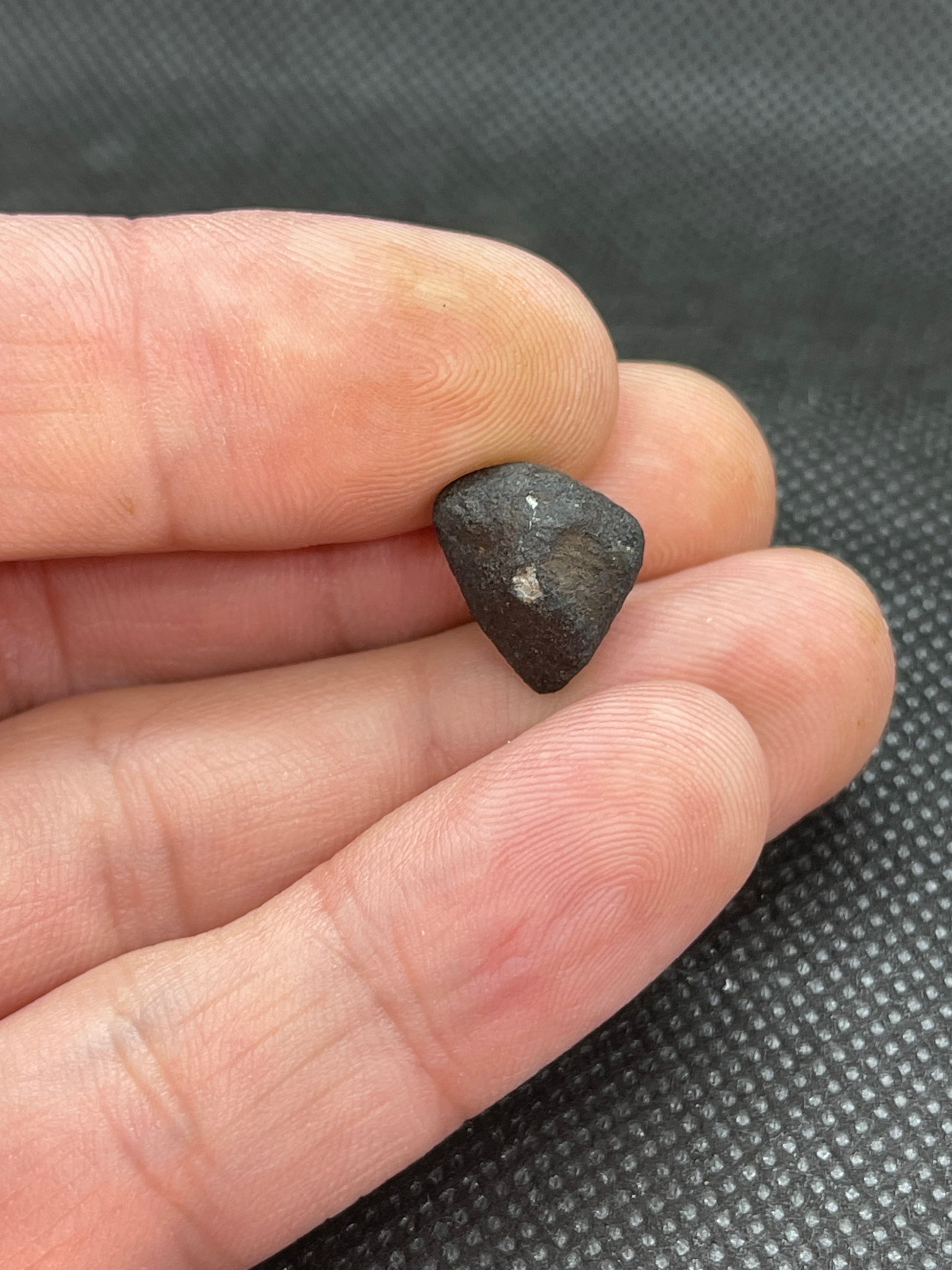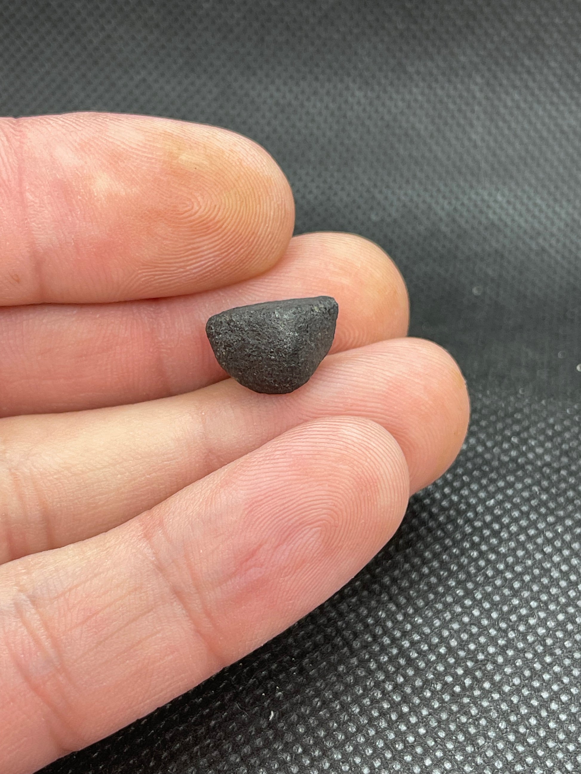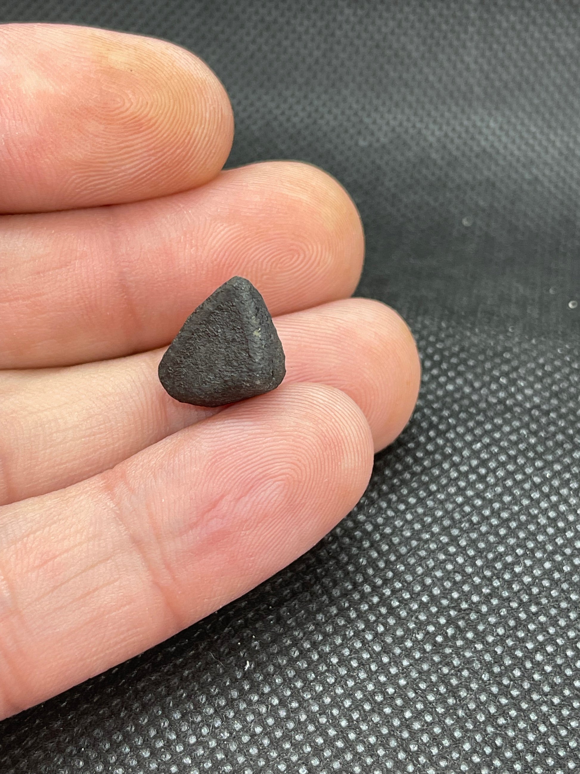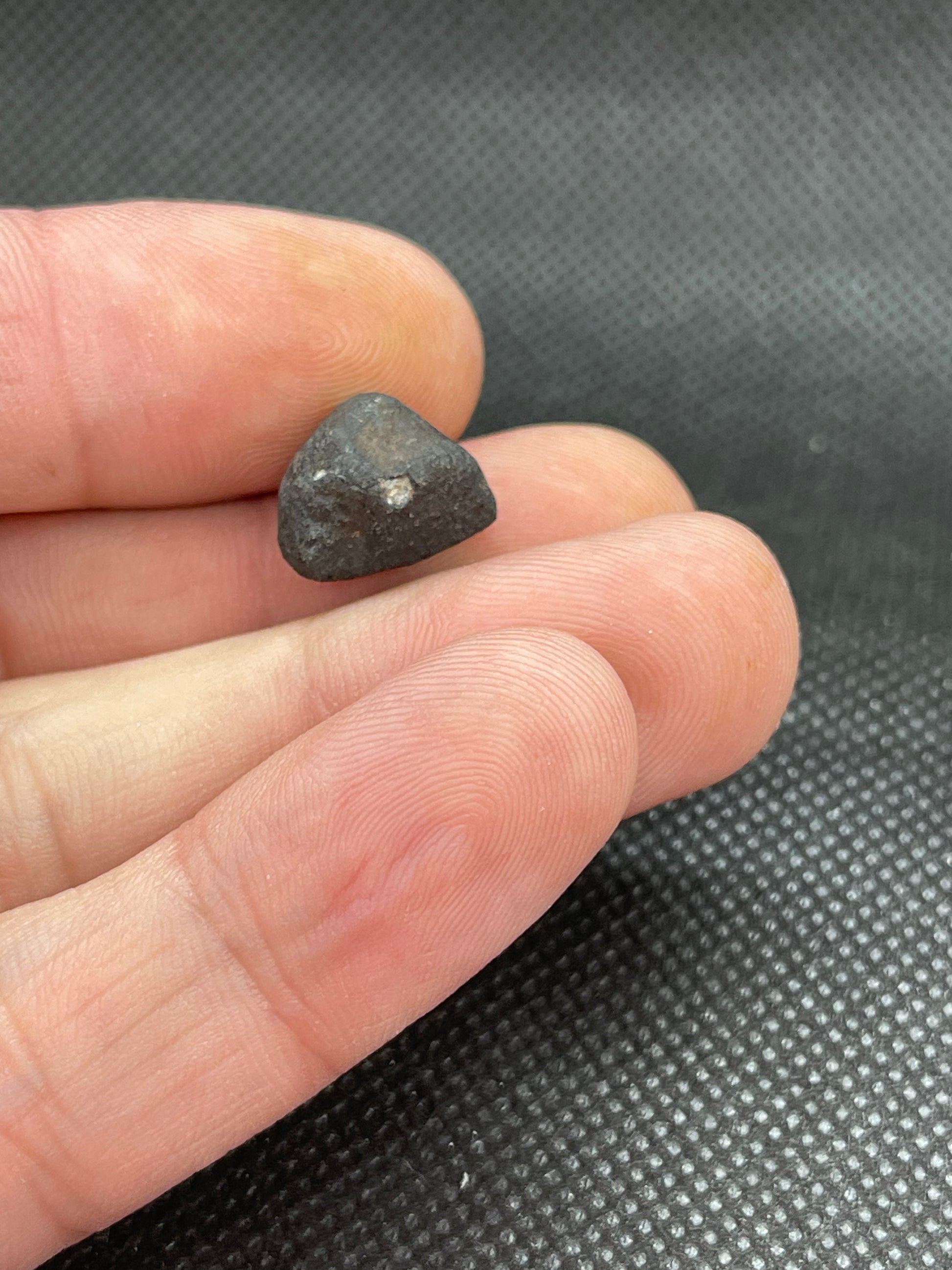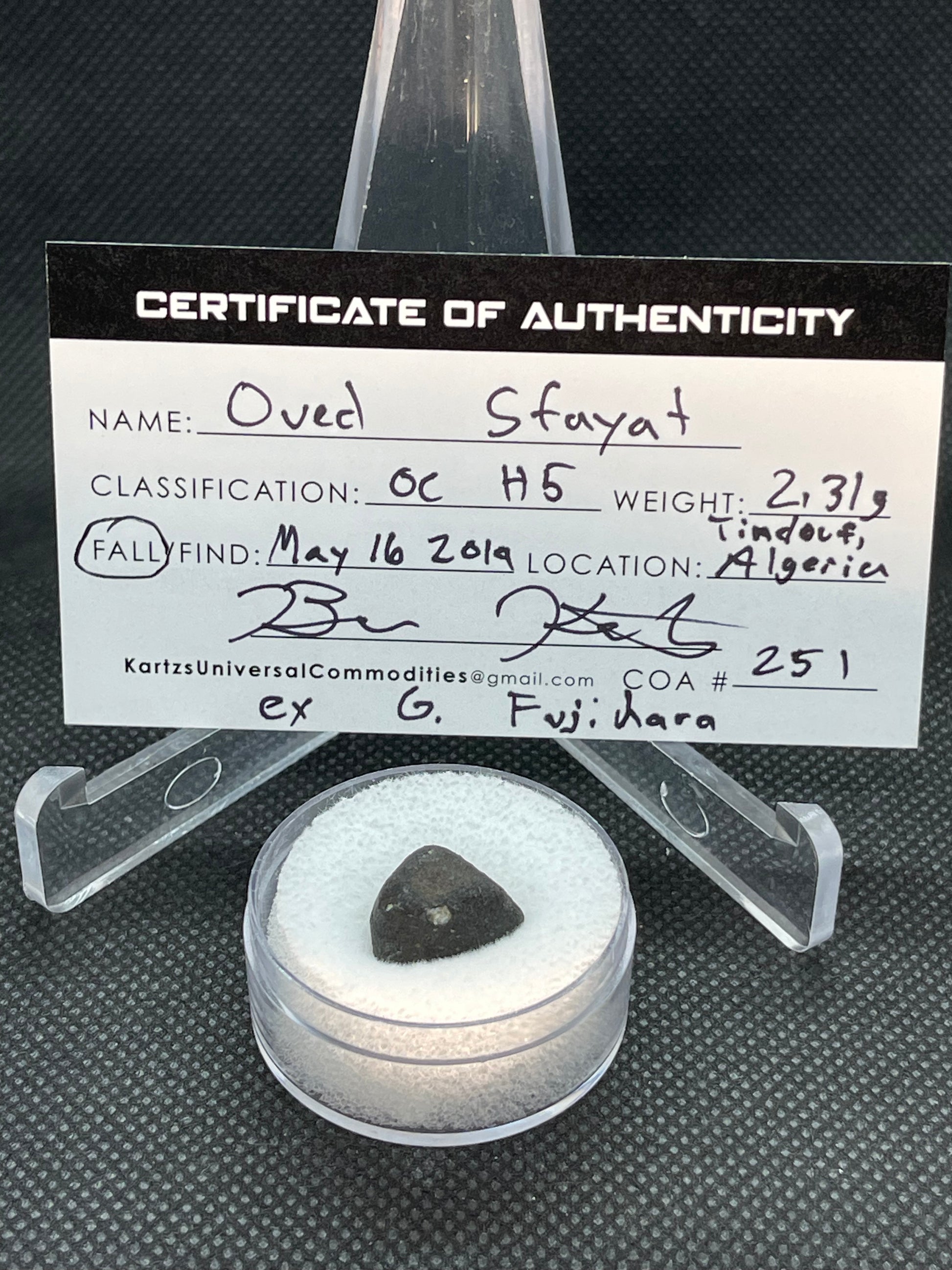 Here is a great small, complete, individual of a witnessed fall! Featuring mostly complete fresh crust there is nothing like holding a freshly recovered meteorite. This fall was witnessed in Tindouf, Algeria and happened in May 16, 2019. It is classified as an ordinary chondrite: H5. All specimens come in a 1.5 inch gem jar and includes a COA. Purchased from IMCA member Gary Fujihara. This specimen weighs 2.31 grams and is .5 inches at its longest.